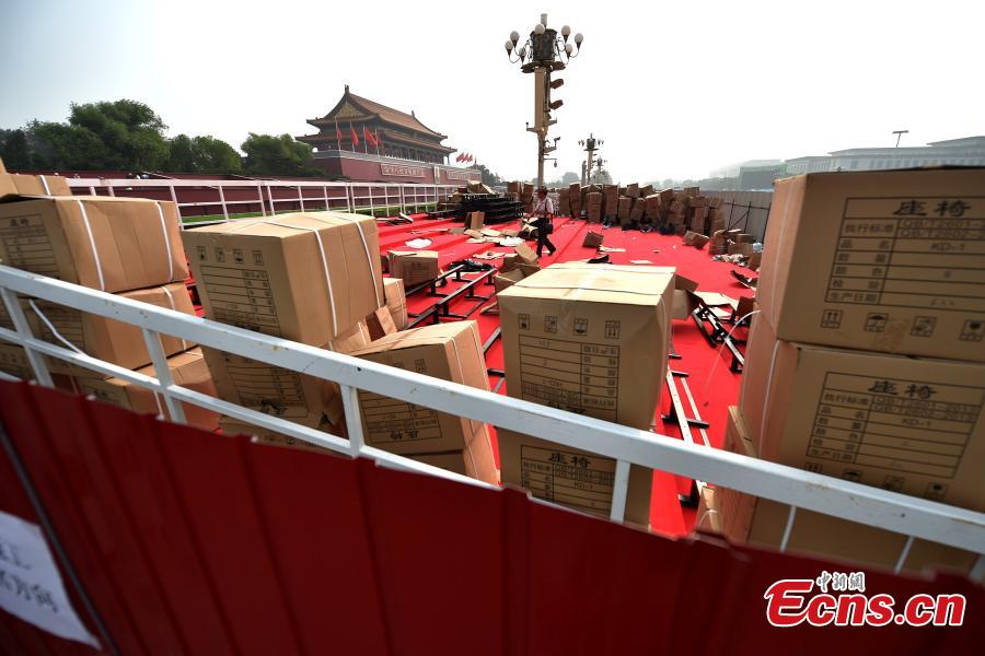 Workers build temporary platforms for people to watch a military parade from on September 3 on the flanks of Tiananmen Tower at the north of Tiananmen Square in Beijing, Aug 11, 2015. The tower is closed as an entrance to the Forbidden City during construction. China is marking the 70th anniversary of victory in the Chinese People's War of Resistance Against Japanese Aggression (1937-1945). (Photo: China News Service/Jin Shuo)