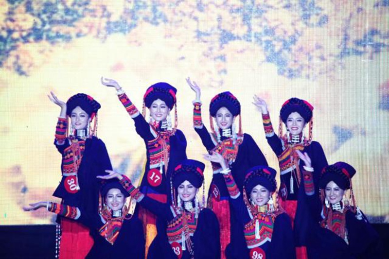 An annual traditional beauty pageant is held during the seventh international Liangshan Yi Torch Festival in Sichuan’s Yi Autonomous Prefecture on Aug. 9, 2015. Women in traditional Yi costumes performed singing and dancing at the event. (CNS/Gao Han)