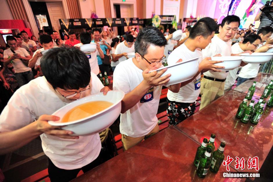 A beer drinking contest is held in Wuhan, central China's Hubei province on Aug. 9. A participant finished a big bowl of beer in 2 minutes. (CNS/Zhong Xin)