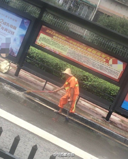 Deng Xianhuo, 69-year-old uniped sanitation worker in southwest China's Sichuan province, goes viral online. (Photo/Weibo of Huaxidushibao)