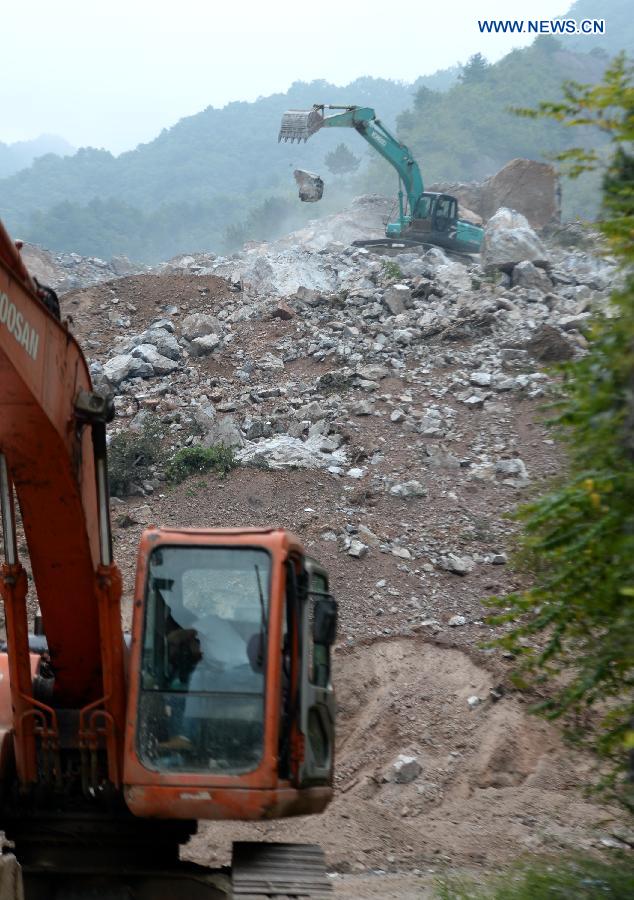Rescuers clean the landslide site in Shanyang County, northwest China's Shaanxi Province, Aug. 12, 2015. (Xinhua/Li Yibo)