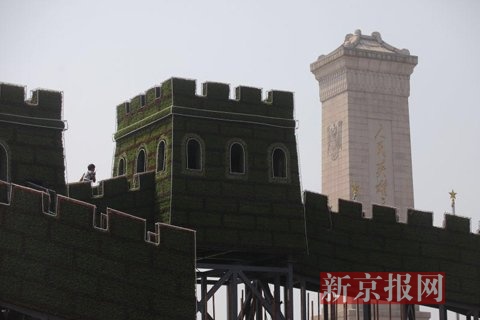 A large-scale Great Wall-shaped flower terrace is being erected in Tiananmen Square in Beijing to celebrate the 70th anniversary of the Chinese People's War of Resistance against Japanese Aggression (1937-1945).