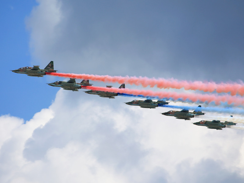 Photo shows the Russian aerobatics team performing in the Aviadarts in Russian 2015 Int'l Army Games on Aug. 10, 2015. (Photo/provided to China.org)