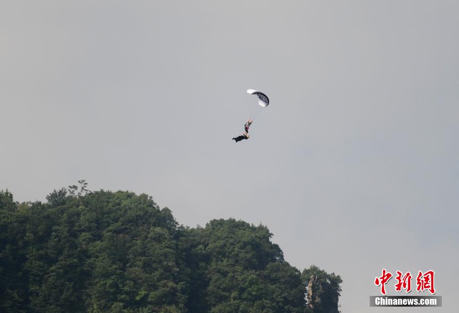 Two wingsuiters from Norway fly over Tianmenshan Mountain in central China's Zhangjiajie on Aug. 11. (CNS/Yang Huafeng)