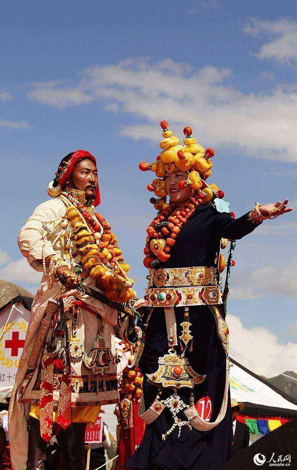 A traditional Tibetan costumes show is held in Zadoi County in northwest China’s Qinghai province on Aug. 7, 2015. Over 140 young men and women wearing Tibetan costumes and precious jewelries participated in the costume performance. (Photo/people.cn)