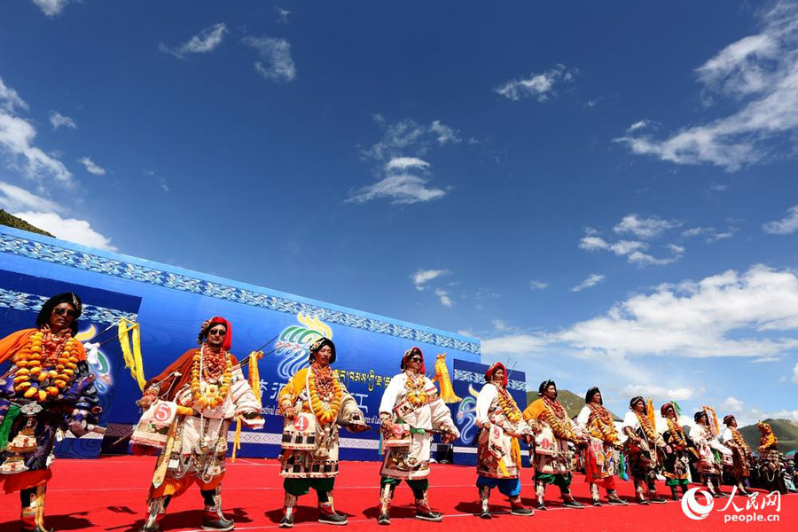 A traditional Tibetan costumes show is held in Zadoi County in northwest China’s Qinghai province on Aug. 7, 2015. Over 140 young men and women wearing Tibetan costumes and precious jewelries participated in the costume performance. (Photo/people.cn)
