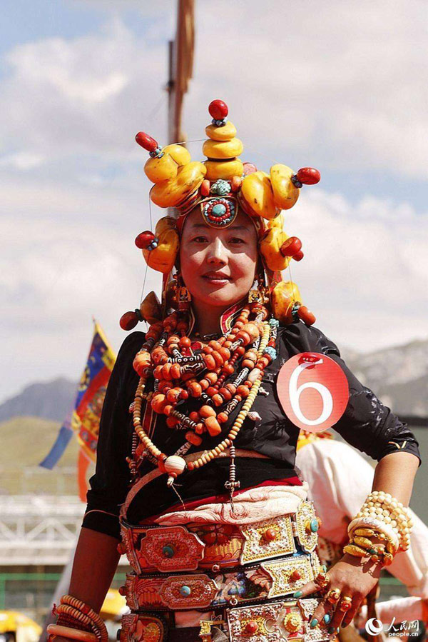 A traditional Tibetan costumes show is held in Zadoi County in northwest China’s Qinghai province on Aug. 7, 2015. Over 140 young men and women wearing Tibetan costumes and precious jewelries participated in the costume performance. (Photo/people.cn)
