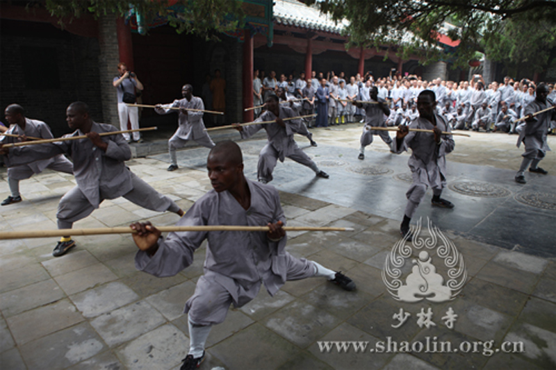 More than 20 foreigners from all over the world pay homage to Shaolin temple in Central China's Henan Province on Aug. 11. Shi Yongxing, the abbot of the Shaolin Temple received them. (Photo/Shaolin.org.cn)