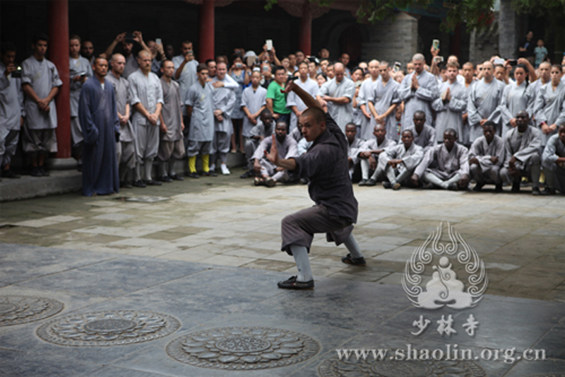 More than 20 foreigners from all over the world pay homage to Shaolin temple in Central China's Henan Province on Aug. 11. Shi Yongxing, the abbot of the Shaolin Temple received them. (Photo/Shaolin.org.cn)