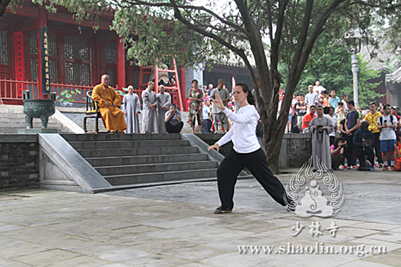 More than 20 foreigners from all over the world pay homage to Shaolin temple in Central China's Henan Province on Aug. 11. Shi Yongxing, the abbot of the Shaolin Temple received them. (Photo/Shaolin.org.cn)