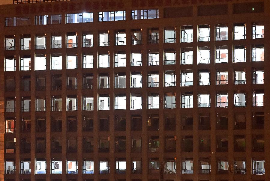 | Shattered windows of a nearby building are seen after an explosion in the Binhai New Area in north China's Tianjin Municipality on Aug. 13, 2015. An explosion rocked the Binhai New Area in north China's Tianjin Municipality at around 11:30 p.m. Wednesday. The cause and casualties are not immediately known. (Xinhua/Yue Yuewei) |