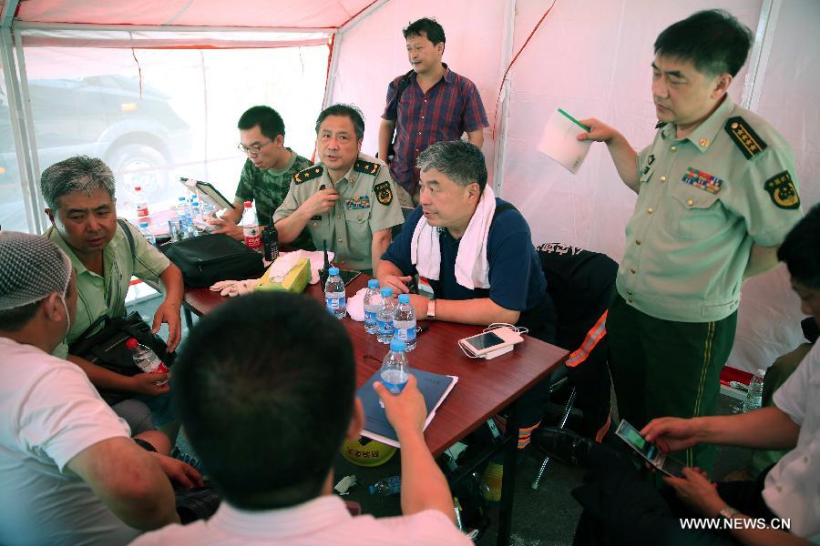 Staff members of Fire and Rescue Headquarters command rescue work near the explosion site in Binhai New Area of Tianjin, north China, Aug. 13, 2015. The death toll has climbed to 44 from two massive blasts that ripped through a warehouse in north China's port city of Tianjin as of Thursday noon, according to rescue headquarters. Twelve firefighters were among the dead. (Xinhua/Jin Liwang)