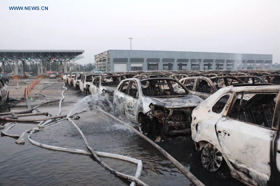 Photo taken on Aug. 13, 2015 shows cars damaged at a car storage near the explosion site in the Binhai New Area in north China's Tianjin Municipality. The death toll from a Tianjin warehouse blast Wednesday night has climbed to 17, according to rescuers. Another 32 people were critically injured and 283 people are under observation in hospital. (Xinhua)