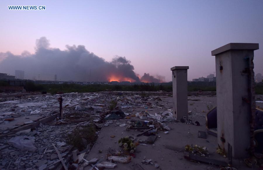 Photo taken on Aug. 13, 2015 shows smoke rising at the explosion site in the Binhai New Area in north China's Tianjin Municipality. The death toll from a Tianjin warehouse blast Wednesday night has climbed to 17, according to rescuers. Another 32 people were critically injured and 283 people are under observation in hospital. (Xinhua/Yue Yuewei)