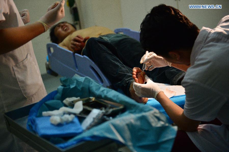 A man injured in the explosion of the Binhai new district receives treatment in Tianjin Taida Hospital in north China's Tianjin Municipality, Aug. 13, 2015. The death toll has climbed to 44 from two massive blasts that ripped through a warehouse in north China's port city of Tianjin as of Thursday noon, according to rescue headquarters. Twelve firefighters were among the dead. (Xinhua)