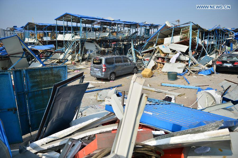 Dormitory buildings at a construction site near the explosions are critically damaged at the Binhai new district in north China's Tianjin Municipality, Aug. 13, 2015. The death toll has climbed to 44 from two massive blasts that ripped through a warehouse in north China's port city of Tianjin as of Thursday noon, according to rescue headquarters. Twelve firefighters were among the dead. (Xinhua)