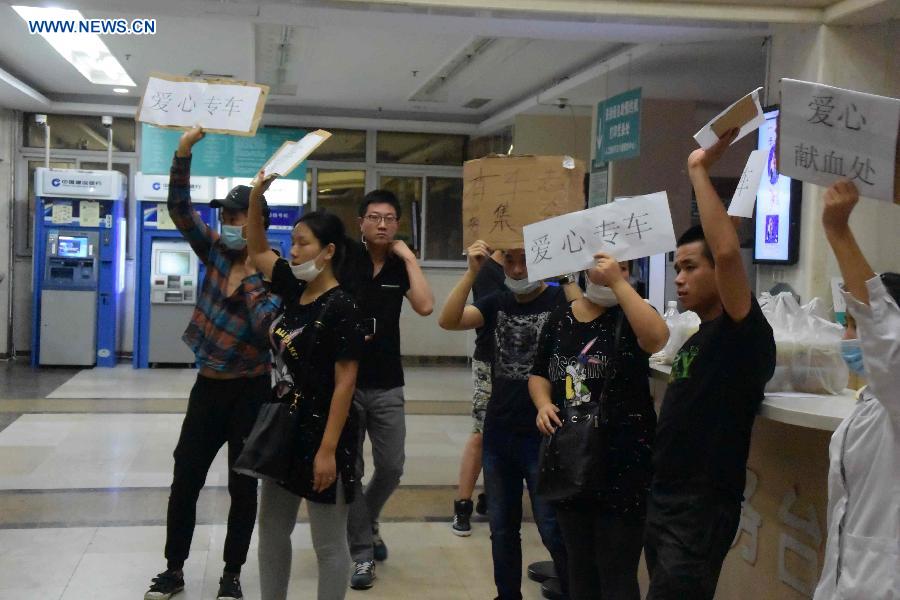 Volunteers offer help at a hospital in north China's Tianjin Municipality, Aug. 13, 2015. A series of massive explosions ripped through a warehouse storing dangerous goods in the Binhai New Area in northeastern China's Tianjin municipality at around 11:20 p.m. Wednesday, killing at least 17 and injuring more than 400. (Xinhua/Zhang Chenlin)