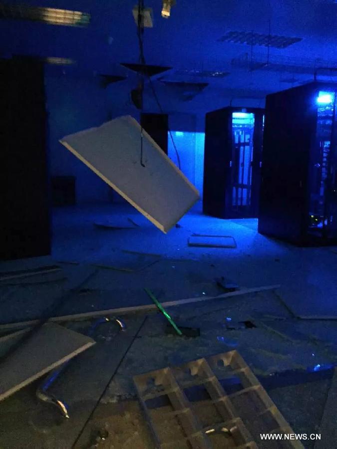 Photo taken on Aug. 13, 2015 shows the damaged building near the site of the explosions in the Binhai New Area in north China's Tianjin Municipality. A series of explosions at a warehouse for dangerous goods in north China's Tianjin Municipality killed at least 17 people. Another 32 people were critically injured and 283 people are under observation in hospital. (Xinhua/Yue Yuewei)