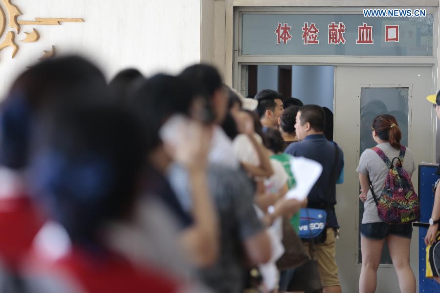 People queue to donate blood in Tianjin Blood Center in Tianjin, north China, Aug. 13, 2015. The death toll has climbed to 44 from two massive blasts that ripped through a warehouse in north China's port city of Tianjin as of Thursday noon, according to rescue headquarters. Twelve firefighters were among the dead. (Xinhua)
