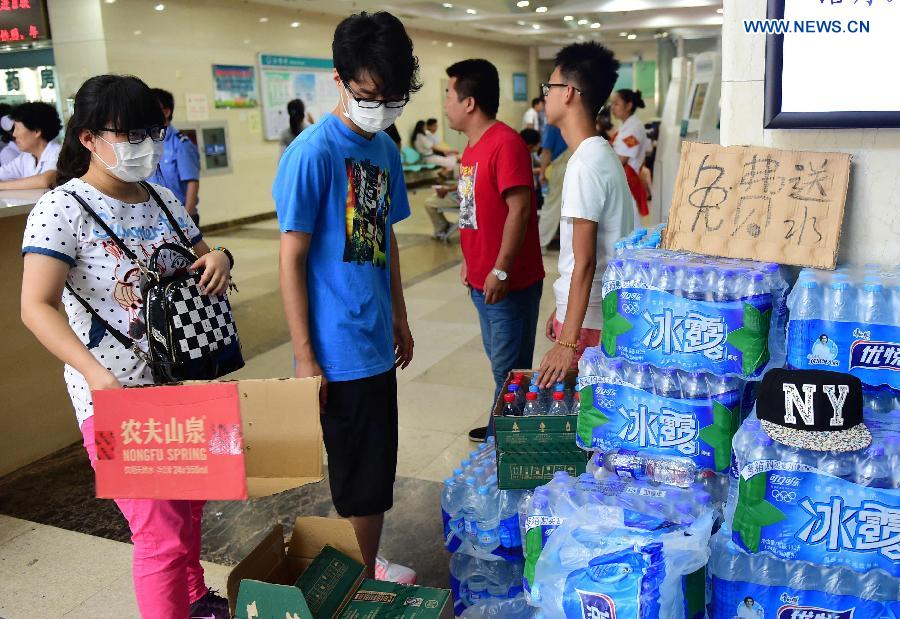 Volunteers set up a supply site at the hospital, providing free water and food in Tianjin, north China, Aug. 13, 2015. The death toll has climbed to 44 from two massive blasts that ripped through a warehouse in north China's port city of Tianjin as of Thursday noon, according to rescue headquarters. Twelve firefighters were among the dead. (Xinhua/Zhang Chenlin)
