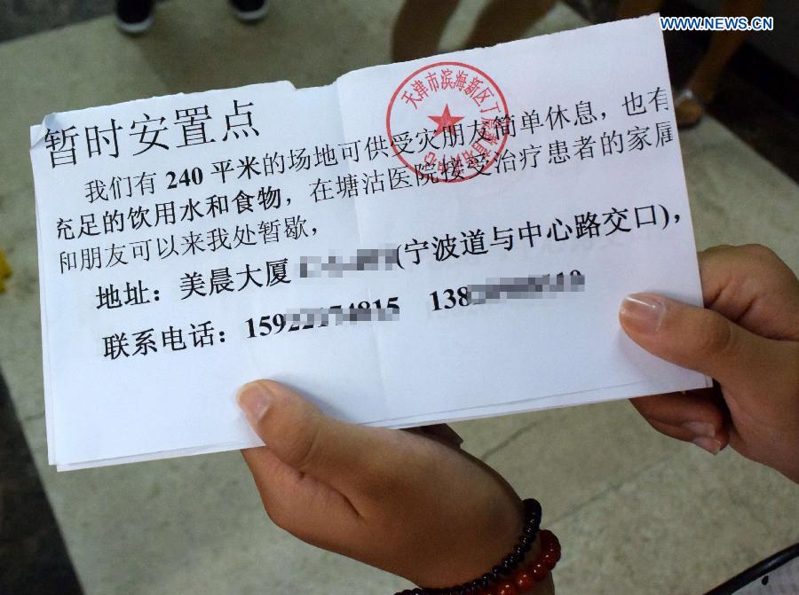A volunteer holds a card showing the address and contact infomation of an emergent shelter in Tianjin, north China, Aug. 13, 2015. The death toll has climbed to 44 from two massive blasts that ripped through a warehouse in north China's port city of Tianjin as of Thursday noon, according to rescue headquarters. Twelve firefighters were among the dead. (Xinhua/Zhang Chenlin)