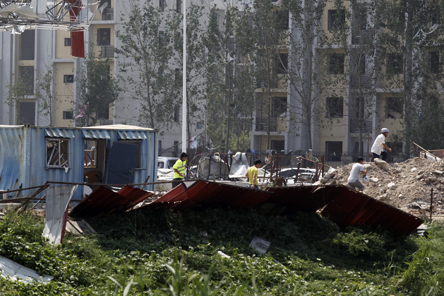Residents walk among the ruins at the blast site in North China's Tianjin on Aug 13, 2015. [Photo by Zhu Xingxin/ China Daily]