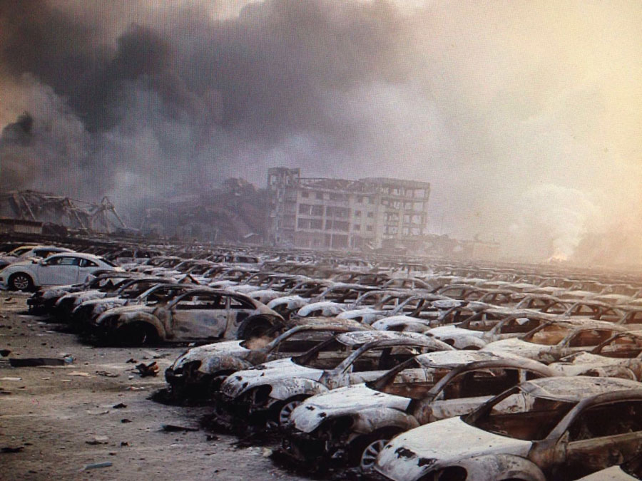 Smoke rises over damaged containers and cars after huge explosions rocked the port city of North China's Tianjin, August 13, 2015. [Photo by Xu Jingxing/ China Daily]