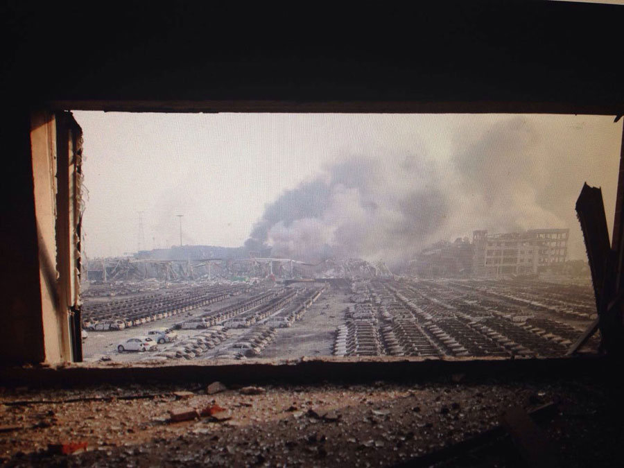 | Smoke rises over damaged containers and cars after huge explosions rocked the port city of North China's Tianjin, August 13, 2015. [Photo by Xu Jingxing/ China Daily] |
