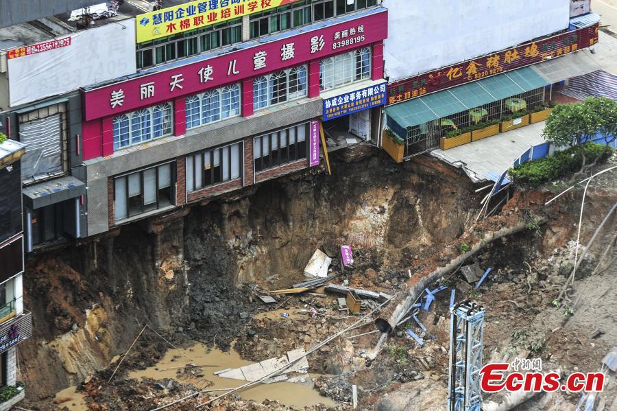 Workers fill a cave-in with cement at a subway construction site in Dongguan city, South China’s Guangdong province, Aug 13, 2015. One worker died after a 300-square-meter area collapsed at the site. A car was also swallowed into the hole during the collapse on Wednesday. The accident also caused water and gas pipelines to burst. (Photo: China News Service/Chen Jimin)