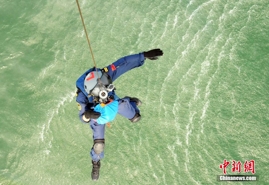 A fisherman was suddenly hit by breathing difficulty and fell into coma when fishing in the sea near Longkou, east China's Shandong province on Aug. 10, 2015. A rescue helicopter flied over 50 nautical miles to transport the fisherman to hospital. (Photo/CNS)
