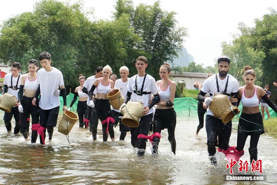 Contestants from 10 Asian countries taking part in the final of Asian Super Model Contest attend an interesting “fish catching contest” in Guilin, south China’s Guangxi on Aug. 12, 2015. (CNS/Luo Wengang)