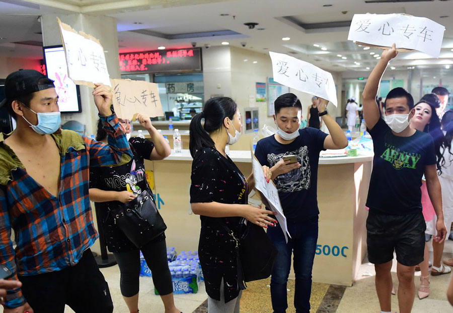 Volunteers offer car service to the injured persons in a hospital in Tianjin on Aug. 13, 2015. (Photo/Xinhua)