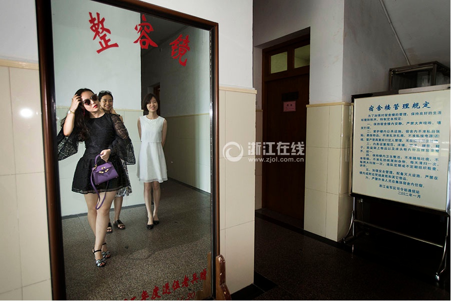 The soldiers look at the mirror before they go out. (Zhejiang Online/Tong Xiaolei)