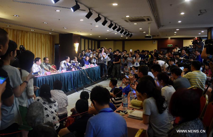 A press conference relate to the explosion at Binhai district was held in Tianjin, north China, Aug. 13, 2015. Several containers caught fire before the warehouse explosion at Tianjin Port on Wednesday night, authorities said on Thursday. A total of 3,500 people have been relocated to 10 nearby schools, Zhang Yong, head of the Binhai district government said. (Xinhua/Zhang Chenlin)