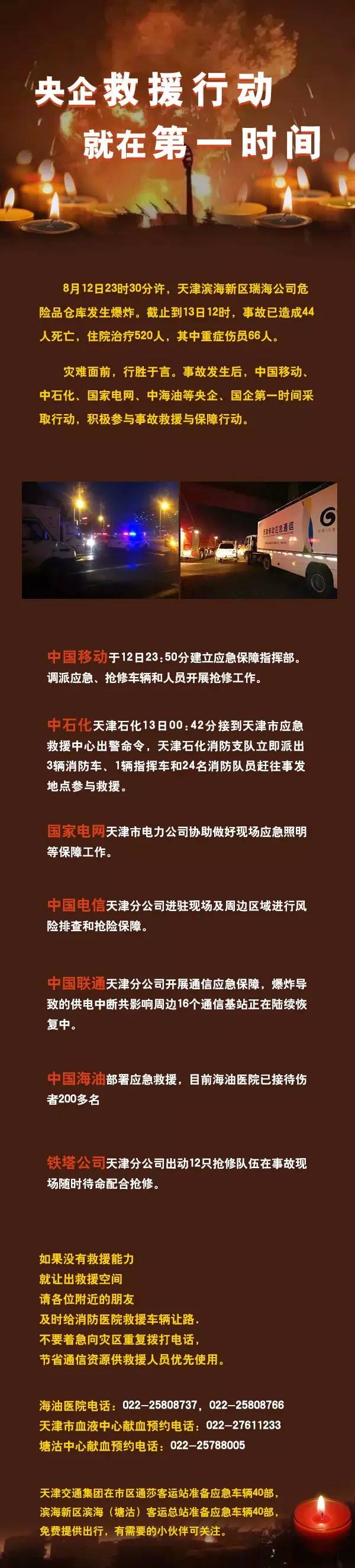 The State Grid Tianjin Electric Power Co. sent its emergency first-response team to assist with emergency power supply and Sinopharm provided medicine for the injured, said the SASAC.