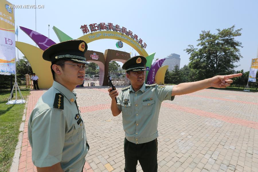 | Police patrol at the south gate of Qingdao International Beer Festival in Qingdao, east China's Shandong Province, Aug. 14, 2015. The 25th Qingdao International Beer Festival will be held from Aug. 15 till 31. (Xinhua/Wang Heng) |