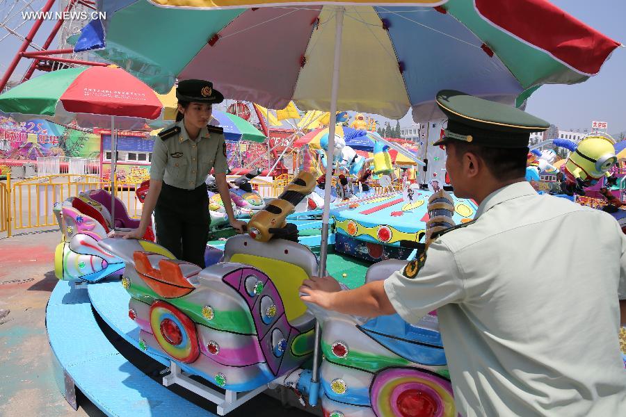 Police examine carnival facilities of Qingdao International Beer Festival in Qingdao, east China's Shandong Province, Aug. 14, 2015. The 25th Qingdao International Beer Festival will be held from Aug. 15 till 31. (Xinhua/Wang Heng)
