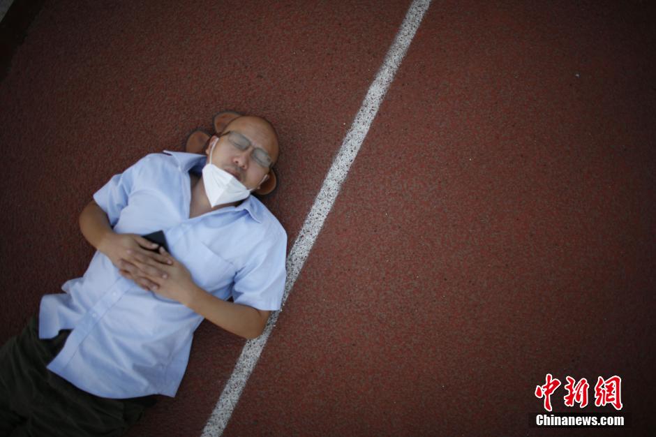 A local primary school has been transformed into a shelter for the victims of Tianjin blasts. A man rests in the playground of the school. (Photo/CNS)
