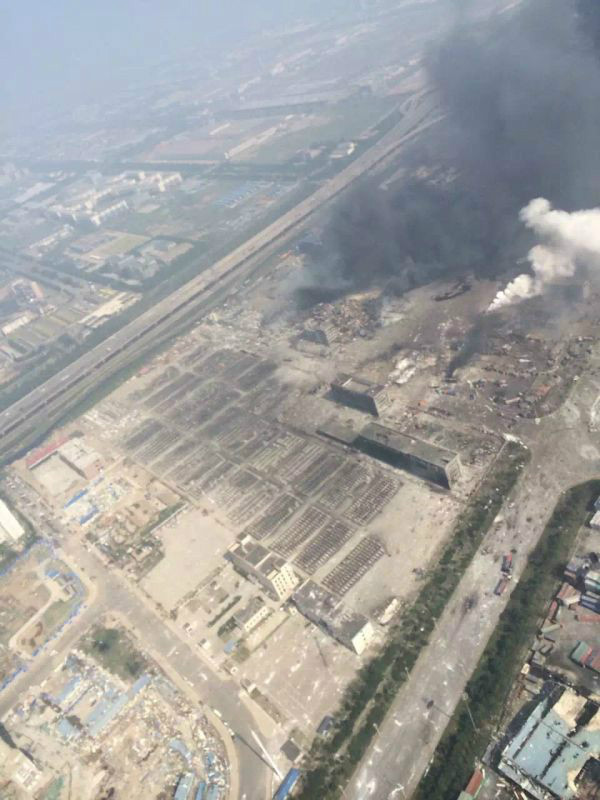 At 11 p.m. on Aug. 12, explosions occurred in a warehouse of Ruihai Company in the International Logistics Center in Tianjin. As of Aug. 14, at least 50 people, including 12 firefighters, had died and more than 500 had been injured. The photo is taken after the explosions. (Photo from The Beijing News)