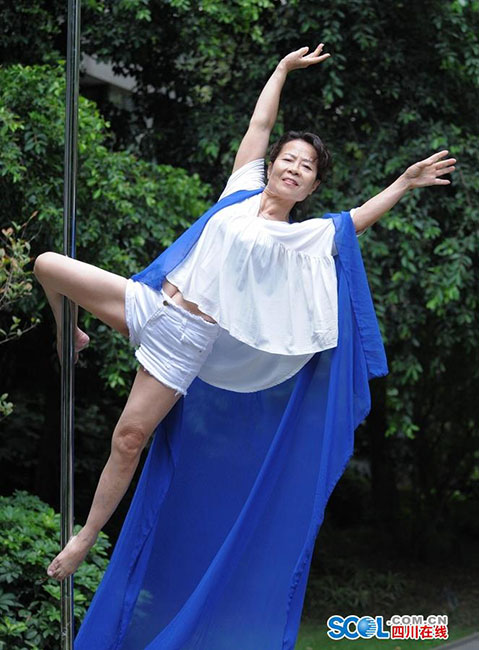 Dai Dali, 70, practices pole dancing in Chengdu city, capital of southwest China's Sichuan province. (Photo/ scol.com.cn)