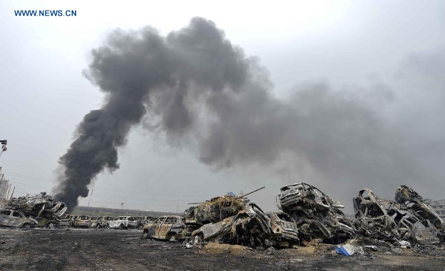 Damaged cars explose and trigger new blasts at the site of explosion in Tianjin, north China, Aug. 15, 2015. Death toll rose to 85 as of Friday night, including 21 firemen, from the massive warehouse explosions hitting north China's Tianjin City Wednesday night, the rescue headquarters said Saturday. Meanwhile, 721 others were hospitalized, including 25 critically wounded and 33 in serious condition. (Xinhua/Yue Yuewei)