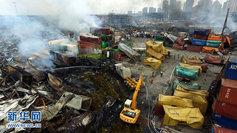An aerial photo taken on Aug. 14, 2015 shows a huge hole at the core area of explosion site in Tianjin, north China. The death toll from explosions occurred on Wednesday night rises to 85 as of Saturday morning. (Xinhua)