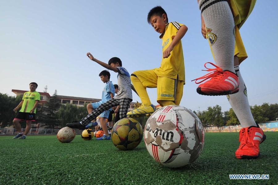 Members of a soccer team of Xijie Experimental Elementary School receive training in Xinjiang County of Yuncheng City, north China's Shanxi Province, Aug. 14, 2015. (Xinhua/Gao Xinsheng)
