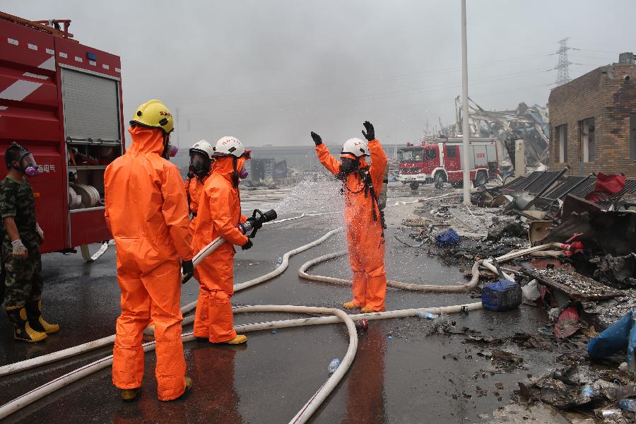 A firefighter wearing chemical protective clothing is sterilized at the site of explosion in Tianjin, north China, Aug. 15, 2015. Death toll rose to 85 as of Friday night, including 21 firemen, from the massive warehouse explosions hitting north China's Tianjin City Wednesday night, the rescue headquarters said Saturday. Meanwhile, 721 others were hospitalized, including 25 critically wounded and 33 in serious condition. (Xinhua/Jin Liwang)
