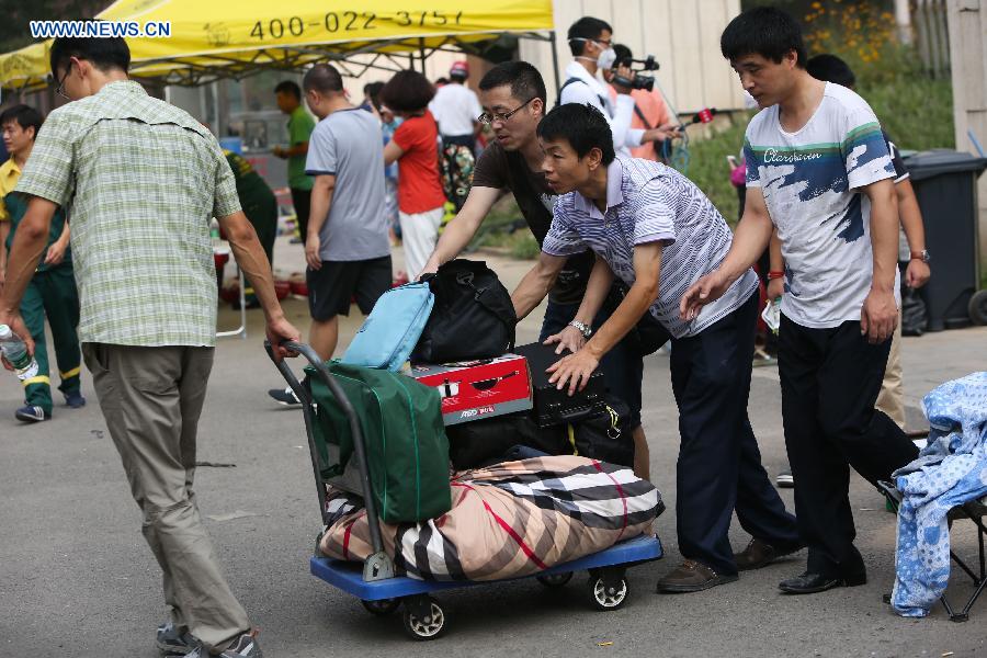 Residents rush to leave after getting an evacuation order near the core area of explosion site in Tianjin, north China, Aug. 15, 2015. All people within 3-km radius are required to evacuate from Tianjin blasts site. (Xinhua/Zheng Huansong)