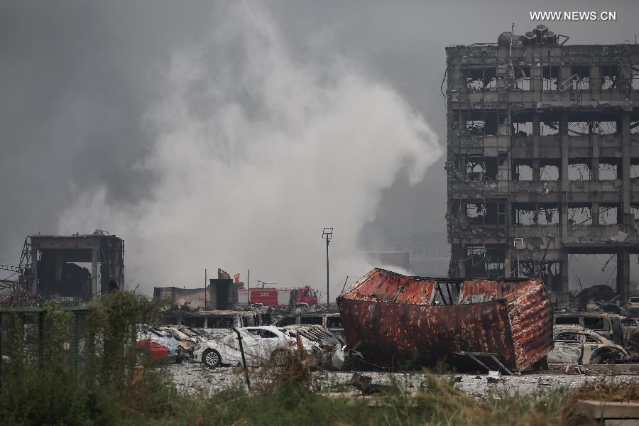 | Fire fighters extinguish a fire at the warehouse explosion site in Tianjin, north China, Aug. 15, 2015. Death toll rose to 104 from the massive warehouse explosions hitting north China's Tianjin city Wednesday night, local authorities said on Saturday night. (Xinhua/Jin Liwang) |