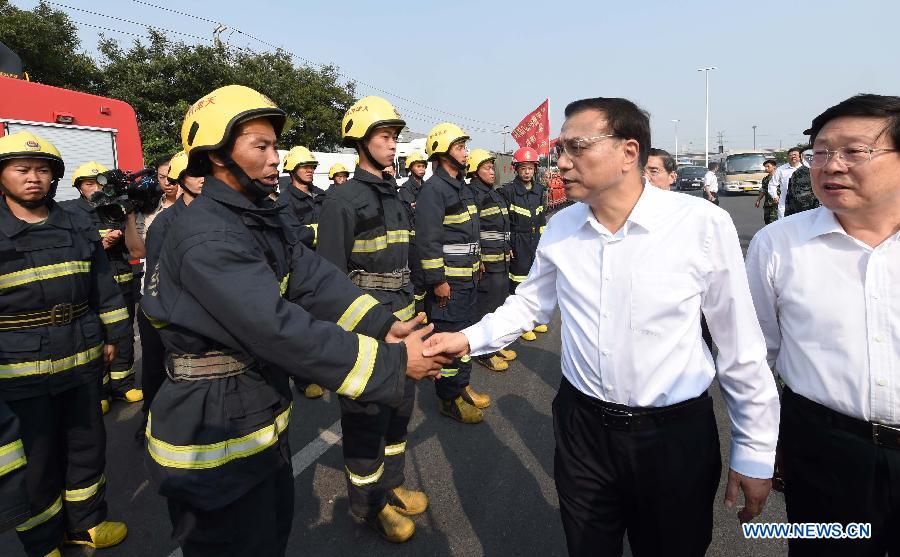 Chinese Premier Li Keqiang (2nd R) visit fire fighters working at the explosion site in Tianjin, north China, Aug. 16, 2015. Li visited fire fighters, rescuers and those injured in the calamity. Li also directed further rescue operations and treatment of the injured, as well as handling of the aftermath and production safety. (Xinhua/Zhang Duo)