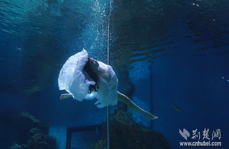 An underwater pole dance show is held at Wuhan Polar Ocean World, Aug. 14, 2015. The performer was Zhang Mingli, who is a polar dance instructor. She said it is much harder to perform pole dance under water since the pressure was difficult to control. (Photo/Cnhubei.com)