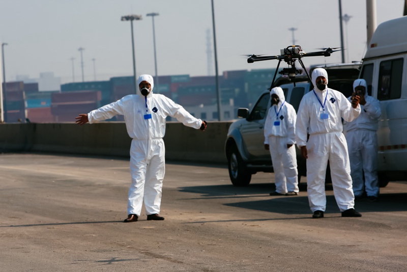 On Aug. 16, 2015, drones are used to survey the explosion site and nearby areas after the massive warehouse blasts in north China's Tianjin City last Wednesday. (Xinhua/ Zheng Huansong)