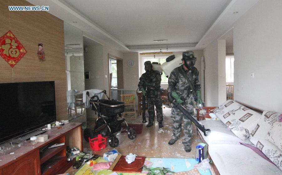 Military specialists in handling nuclear and biochemical materials decontaminate at a residential community near the core area of the warehouse explosion site in Tianjin, north China, Aug. 18, 2015. (Xinhua/Wang Haobo)